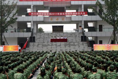 2011年9月11日上午,万象城awcsport官网和盛校区再一次被十分壮观的橄榄绿覆盖,学院历史上规模最大的新生军训汇报暨开学典礼在此隆重举行。