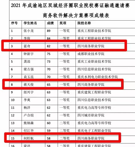 近日,由重庆智慧物联职业教育集团主办的成渝地区双城经济圈职业院校赛证融通邀请赛商务软件解决方案赛项在渝举行。万象城信息技术系蓝奇、蒋天俊同学荣获一等奖, 何柠航同学荣获二等奖,王胜同学荣获三等奖,信息安全专业负责人刘磊和校企共建教师李斌、夏祎忞、罗丹等共同担任参赛指导教师。 据悉,成渝两地共有20余所高职院校参赛,比赛面向产业主流技术、对接国际标准,旨在通过融合世界技能大赛的技术标准和规则...