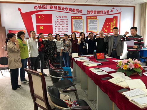 “我志愿加入中国共产党……随时准备为党和人民牺牲一切,永不叛党”,这是发生在10月12日教学管理党支部里庄严的一幕。教学管理党支部书记刘小平同志作为领誓人,面对鲜红的党旗,带领支部全体党员一起高举右手,再次郑重宣誓。