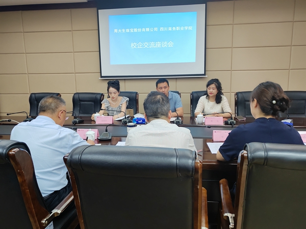 6月20日下午,周大生珠宝股份有限公司西南大区负责人杨勇,人事负责人程红,培训负责人陆晓玲来学院开展校企合作交流座谈会。学院党委委员、副院长官培生,党委委员、经济贸易系主任朱贵水,副主任李静及相关老师参加了座谈。