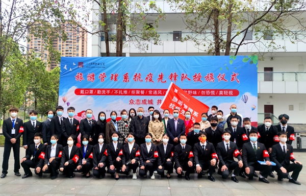 3月22日中午,旅游管理系举行了学生抗疫先锋队成立暨授旗仪式,先锋队由28名学生入党积极分子、预备党员及学生党员组成,20级休闲体育班学生党员何忠明同学任先锋队队长。