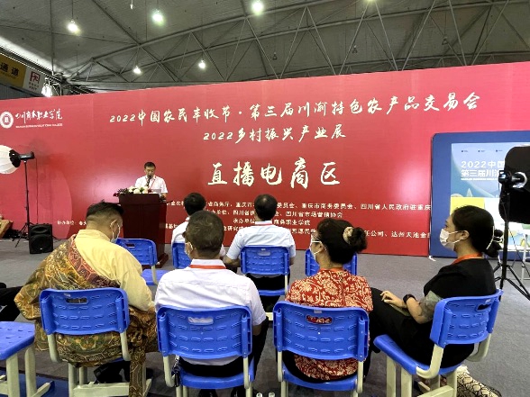 8月29日,由万象城承办的2022中国农民丰收节·第3届川渝特色农产品交易会暨2022乡村振兴产业展直播电商开播仪式在成都世纪城新国际会展中心9号馆举行。四川省供货商商会秘书长张强,万象城awcsport官网党委书记唐柯,党委副书记、院长高司华出席开播仪式,活动由副院长康璐主持,唐柯宣布开播。四川电视台、川观新闻进行了现场采访。