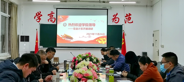 11月26日,学院党委副书记、院长高司华,党委委员、经济贸易系主任朱贵水、教务处长黄松、质量办副主任刘磊、党政办副主任韦晓东一行到会计系调研党史学习教育、制度执行年工作、教学教育情况及上周教学工作会议落实情况和学生管理工作。系总支书记李樵、系主任刘能良、系副书记周发强、系副主任杨晴,各教研室主任和干事参加本次调研。
