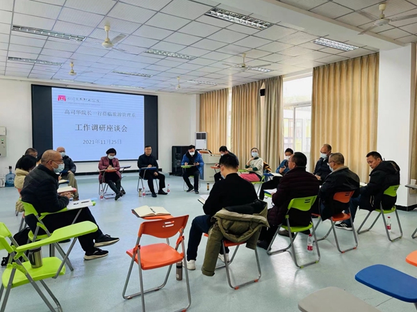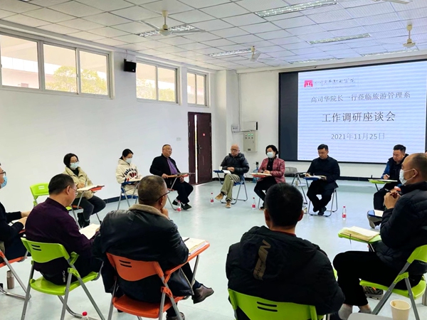 高司华听取了陈根元关于旅游管理系2021年度党政工作开展情况的汇报,分别和旅游管理系党政干部和各专业责任人、专业群责任人等就旅游管理系目前在专业建设、师资队伍建设和产教融合等方面进行了深入交流。