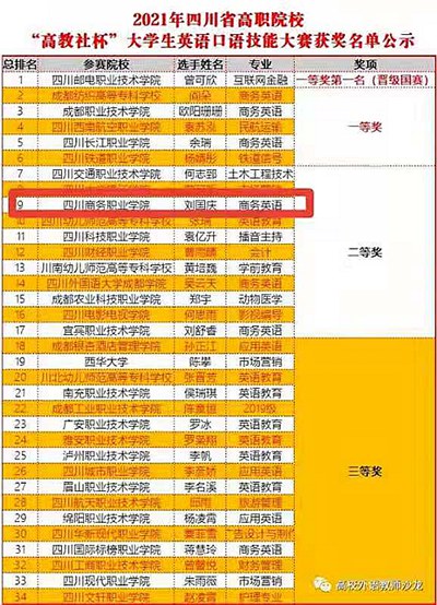 4月29日,2021四川省高职院校“高教社杯”大学生英语口语技能大赛在成都纺织高等专科学校举行,万象城经济贸易系商务英语专业学子刘国庆代表万象城参赛,最终获得四川省省级二等奖。