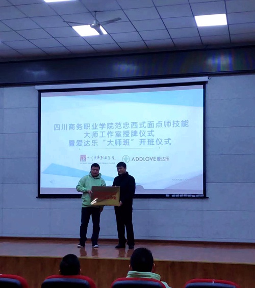 副院长向宏志将学院的“范忠西式面点师技能大师工作室”铜牌授予范忠大师,范忠大师也将“范忠西式面点师技能大师班”铜牌授予旅游管理系。“大师班”代表肖小龙同学会上发言,立志 “把握爱达乐平台,追随范忠大师,刻苦学习,技能成长,献身于烘焙事业”。