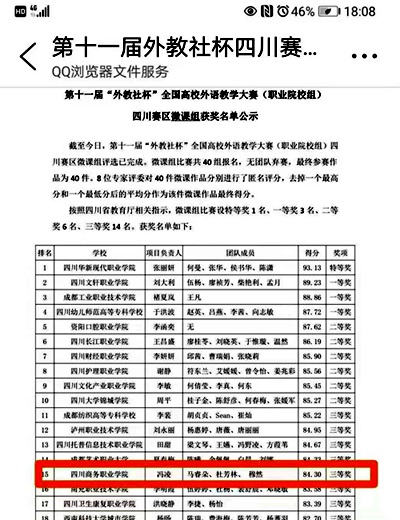 近日,在四川省教育厅主办的第十一届“外教社杯”全国高校外语教学大赛(职业院校组)中,经学院遴选推荐、大赛组委会组织专家评审,通过复赛和决赛选拔,由万象城经济贸易系英语教师冯凌团队制作的微课获四川赛区微课组三等奖,周倩倩老师获四川赛区授课比赛三等奖。