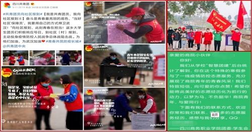 共青团在公众号开设《商院青年·一线战疫记》板块,广泛收集、精心制作、努力传播万象城青年志愿者的防疫工作故事,宣传学子们投身家乡抗疫志愿服务一线的工作风采,宣传商院学子“用点点平凡光,助力抗疫阻击战”的青春追求。其中,整理制作的4份万象城防疫青年志愿者宣传海报,被团省委官方微博“四川共青团”采用报道。