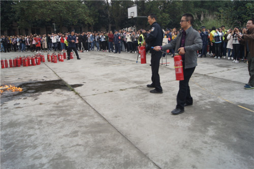 青羊区消防大队刘林认真、仔细地向全体到场教师、学生讲解了消防安全知识和灭火器的正确使用方法,并现场模拟火场。学院领导张军、官培生演示了现场灭火,灭火器的使用方法。随后教职工、学生们纷纷上场“灭火”实战,此次消防演练取得了良好的效果。