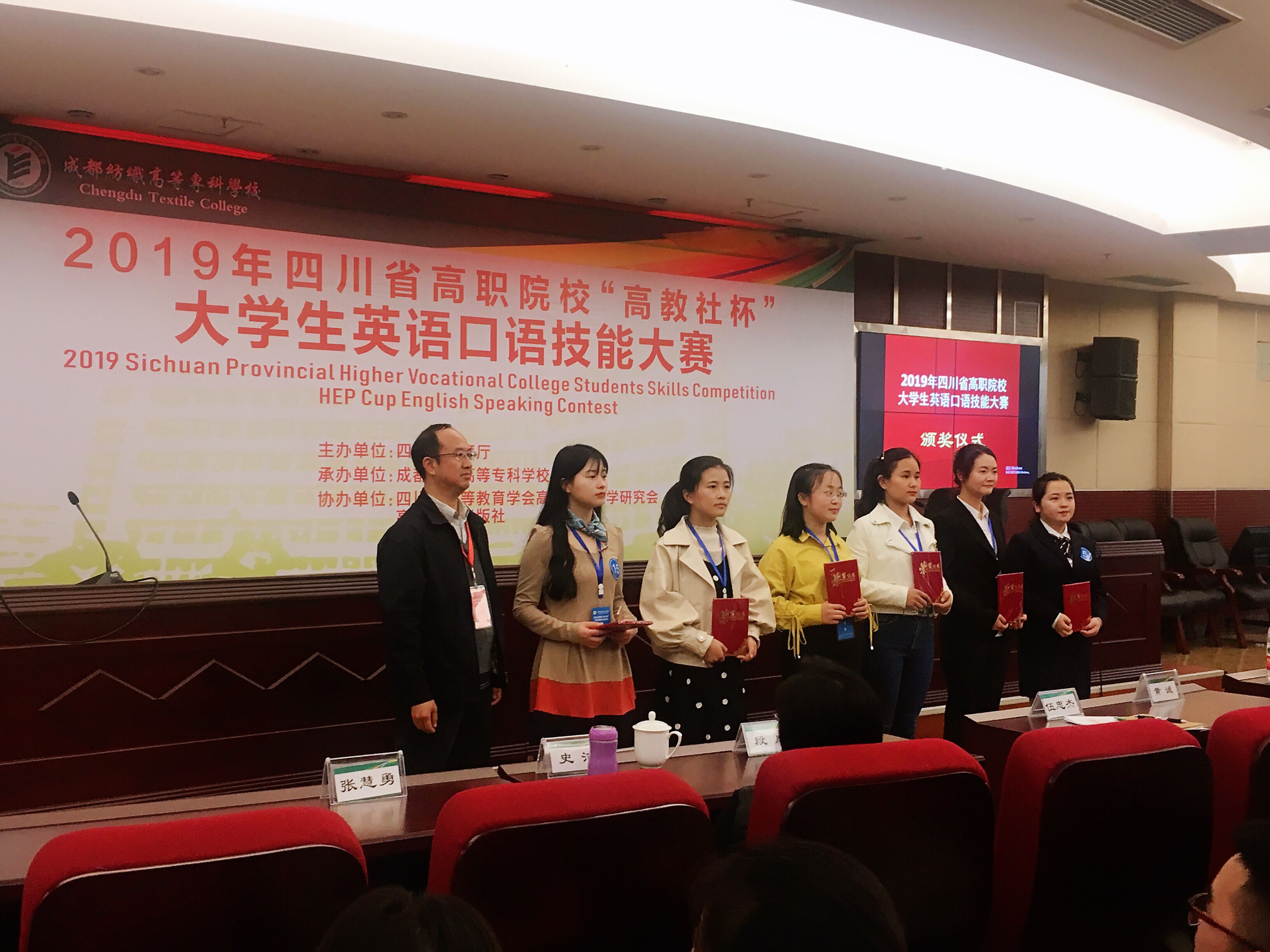 4月4日,2019年四川省高职院校“高教社杯”大学生英语口语技能大赛在成都纺织高等专科学校隆重举行。万象城经贸系商务英语专业学生斩获专业组三等奖。
