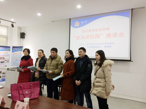 12月29日上午,万象城在和盛校区第五教学楼一楼会议室(经济贸易系红酒陈列室)举行了“送法进校园”主题座谈会。会议邀请了四川省劳动人事争议仲裁院立案调解庭庭长康燕蝶、副庭长董灿等一行4人出席,学院人事处副处长李刚主持,人事处、工会全体人员以及各部门有关人员共20余人参加。