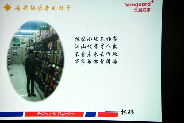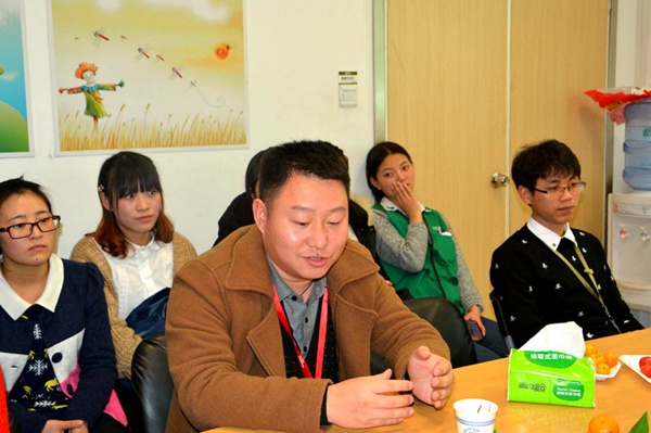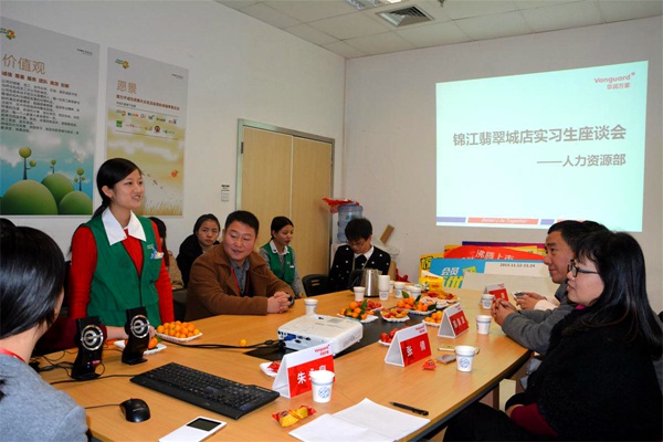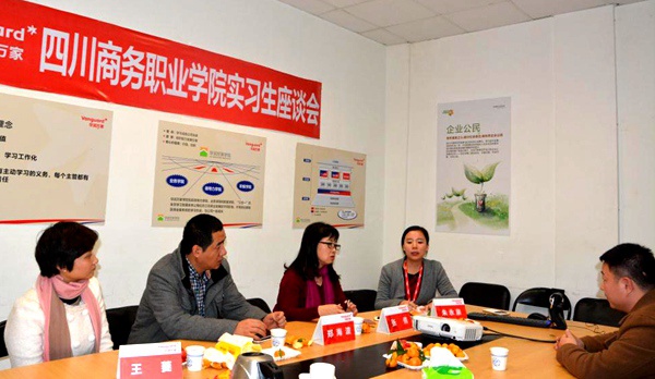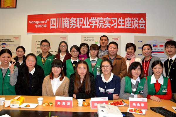 万象城2013级人力资源、连锁经营管理专业共13名学生在华润万家实习5个月以来。学院为了更好的沟通、掌握实习学生生活、工作、思想等情况,12月10日学院经营管理系张倩主任、总支书记郑海波一行4人到华润万家锦江翡翠城店,与公司胡承发经理、陈治宇经理、颜峰经理以及实习学生,共同举办了本次实习生座谈会。