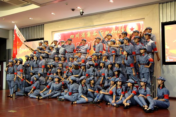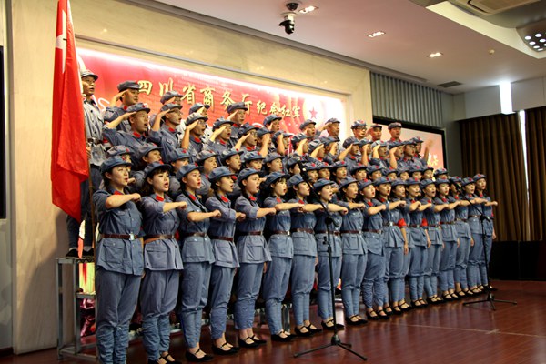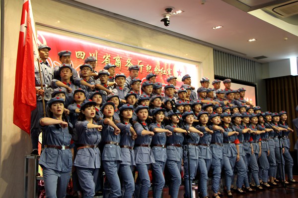 9月29日下午2:00,四川省商务厅纪念红军长征胜利80周年红歌会在厅机关隆重举行,万象城全体院级领导及部分师生代表近80人参加了本次红歌会。历时一个多月的精心编排和悉心准备,万象城党委宣传部、工会负责组织并选送的大合唱《突破封锁线》排在第九个节目出场,师生们以深情的朗诵、优美的歌声、甜美的笑容、和谐的动作、唯美的画面赢得了全场观众雷鸣般的掌声,给大家留下了深刻的印象,最终取得一等奖的优异成绩。