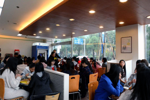 接着,师生们来到位于蛟龙工业港的全家鲜食制作中心。按照企业规范要求,同学们穿上企业精心准备的服装鞋帽,经过全身除尘、除静电、消毒的严格程序后,有序地进入鲜食制作中心进行参观,体验了一把鲜食制作全过程。同学们真切地感受了全家对食品安全和质量的规范要求,对企业的精细化管理深有感触。从鲜食中心出来以后,同学们围着商品课长杨亚霖开始了狂轰滥炸式的提问,杨课长耐心地逐一解答大家的疑问。