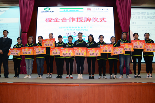 授牌活动正式开始。顶新国际集团便利事业群西南区域公司总监李健鹏手持“校企合作基地”牌子、学院副院长向宏志手持“教学实训与实习基地”牌子,在主持人的宣布下郑重交换,完成了这项严肃而又重大的授牌仪式。全家班三名学生分别获得一等学期奖学金1500元;十三名学生分别获得二等学期奖学金800元。至此,此次严肃而又隆重的授牌仪式,在主持人的总结中、全场热烈的掌声中圆满落下帷幕。