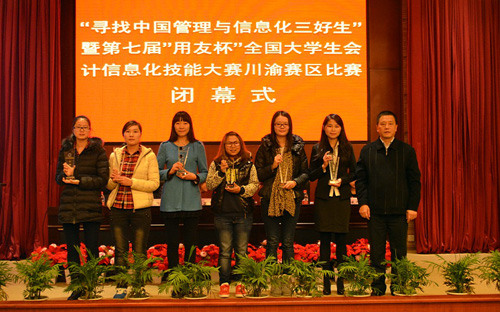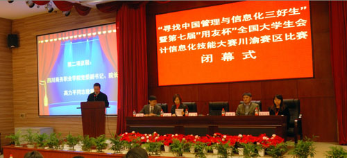 本次川渝赛区比赛吸引了川渝两省市30所高校、56支代表队参加,万象城会计系也派出三支代表队参加。11月22日,各高校代表队陆续到达万象城报到并完成压力测试。11月23日,在完成选手检录后,比赛于上午9点整准时开始,历时3小时,于中午12点结束。经过紧张的统分之后,下午1点30分,“寻找中国管理与信息化三好生”暨第七届“用友杯”全国大学生会计信息化技能大赛川渝赛区比赛闭幕式在万象城商务信息交流中心如期进行,学院党委副书记、院长高力平,党委委员、副院长向宏志出席闭幕式。