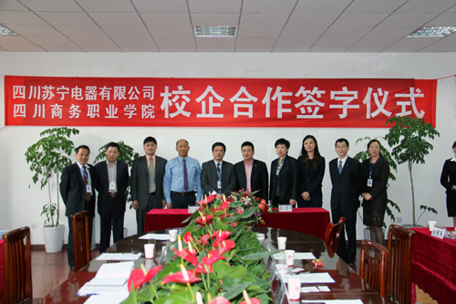 高院长首先代表学院对苏宁电器顾总一行表示了热烈欢迎,并热情介绍他对苏宁电器品牌的忠爱、学院的发展历程、学院在人才培养工作中所取得成就及今后的发展思路;接着苏宁电器顾总诚恳地表示了与学院合作的诚意,介绍了苏宁电器作为中国3C家电连锁零售企业领先者,中国连锁百强之首、国内大型上市优秀企业创立21年来的发展理念以及目前的企业规模、基本业务及当前与院校合作的基本情况;来自09物流专业的徐霞同学代表在苏宁实习的同学发言,介绍她个人在苏宁的学习成长经历及个人的收获,并期待学院能够与苏宁更深层次地合作;最后,高院长与顾总分别代表四川商院与苏宁电器现场签订校企合作办学协议,并相互授予:苏宁电器成为万象城学生“实习就业基地”,万象城成为苏宁电器“员工培训基地”。