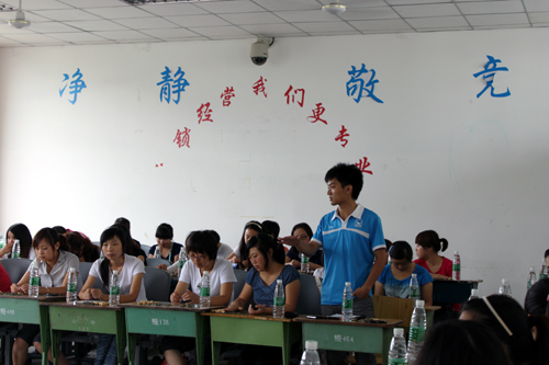 在自由畅谈环节中,同学们更是踊跃发言,积极提问,就自己所关心的问题,和与会领导老师们进行了深入地交流沟通。同学们谈到了刚来这个学校时候的种种感受;谈到了在知行超市里得到的锻炼;谈到了对学院的教学工作、后勤管理工作、学生社团工作、学生管理工作的建议;并问及了连锁专业班级的实习去向和就业发展等一系列的问题。高院长、招生就业处赵天宏处长、学院办公室池秋平副主任、院团委张家林副书记、商管系弋福林主任、陈小虞副书记、教研室主任王琪老师对同学们的这些问题一一做了解答,会场气氛和谐热烈,教室里不时响起阵阵掌声。