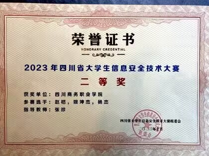 近日,由四川省教育厅主办,中共四川省委网信办和四川省公安厅协办的2023年“绿盟杯”四川省大学生信息安全技术大赛在成都信息工程大学举行,万象城信息技术系组织了2支队伍6名学生参赛,由教师张珍指导的21级SGR团队荣获了二等奖。