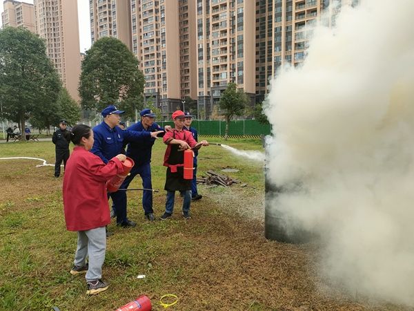 和盛消防站副站长、黄田坝消防中队副中队长为参演师生详细讲解了消防安全知识和灭火器的正确使用方法,并现场示范了如何正确使用灭火器。在消防员的指导下,参演师生、食堂工作人员纷纷上场进行“灭火”实战。