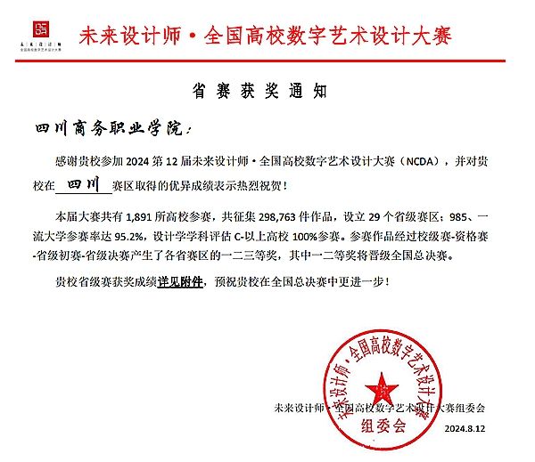 未来设计师全国数字艺术设计大赛(NCDA)是一项由工业和信息化部人才交流中心主办,教育部中国高等教育学会认定,并得到多个省教育厅包括四川省教育厅发文立项,及“学习强国”学习平台支持的国家级大学生竞赛。在此次大赛中,万象城学子共荣获4个国家级奖项,包括一等奖2项、二等奖1项、三等奖1项;同时,他们还获得了14个省级奖项,其中一等奖5项、二等奖4项、三等奖5项。刘钫、周智、钟慧三位老师荣获优秀指导教师奖。万象城也因积极组织赛事以及取得的优秀成绩,荣获了省级赛事优秀组织奖。这一荣誉无疑是对万象城教学水平和专业能力的充分认可。