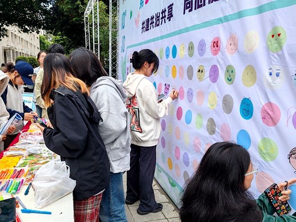 10月10日中午,在“微微一笑拨心弦”的活动现场,同学们兴趣盎然地挑选着不同颜色的画笔,每个人都全神贯注的在桁架上“创造”出一个个生动可爱的笑脸,在自己感到快乐的同时将愉快分享给他人,同时驻足阅读保持平稳心理状态、让生活更美好的12种自我成长攻略,学习利用各类自我调节的方式,提升拥抱变化、适应变化的能力。