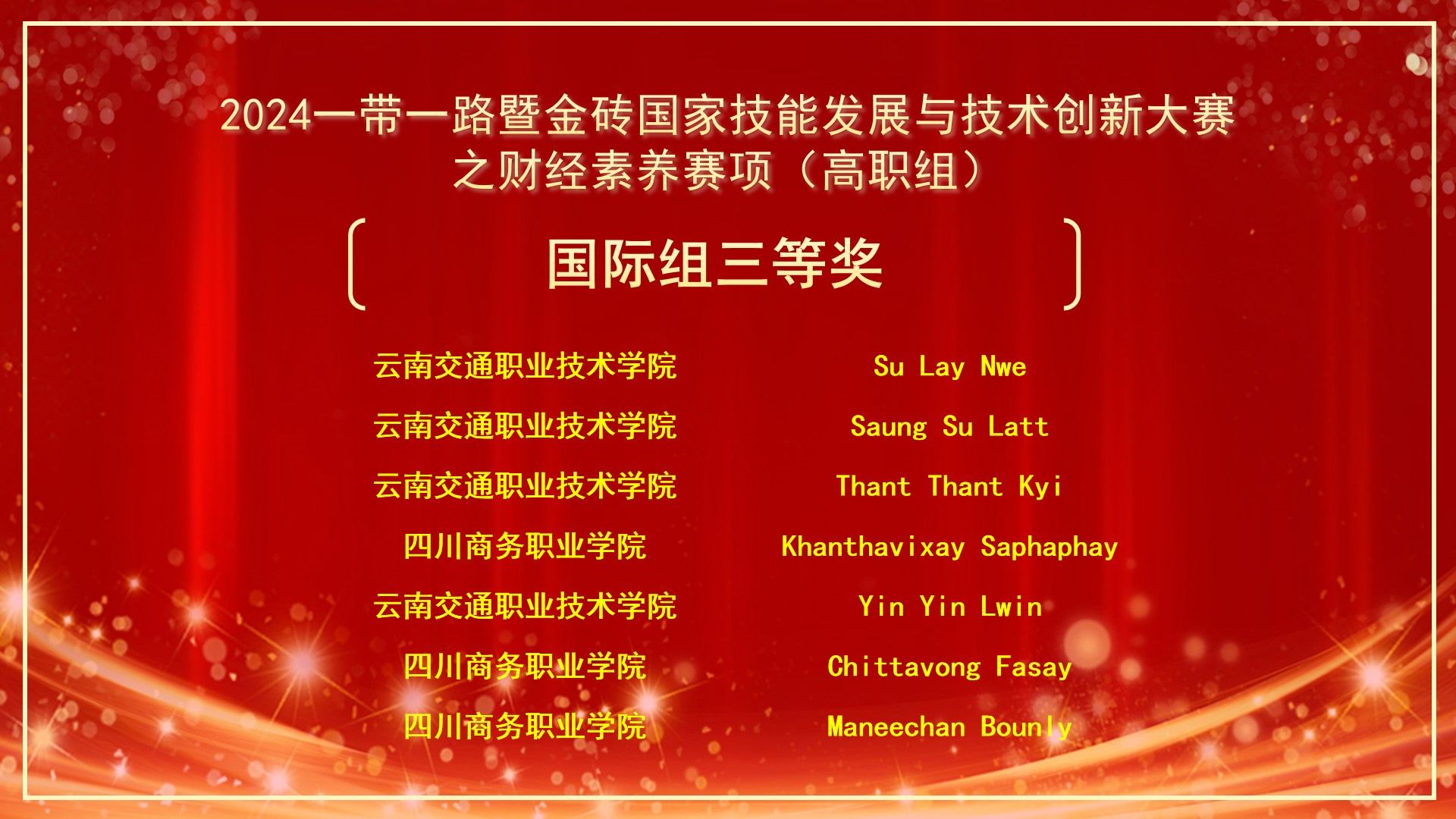 11月23日,“2024一带一路暨金砖国家技能发展与技术创新大赛第二届财经素养赛项”在云南财经职业学院盛大开幕。万象城2022级留学生堤安美、温欣、芙蓉、李博四位同学在经营管理系、国合中心、实践教学中心的精心筹备与悉心指导下,经过激烈而精彩的比拼,最终荣获一个二等奖和三个三等奖的优异成绩,为学院赢得了国际组优秀组织奖的殊荣。这是万象城自开展留学生教育以来,迄今为止留学生技能大赛取得的最高荣誉。