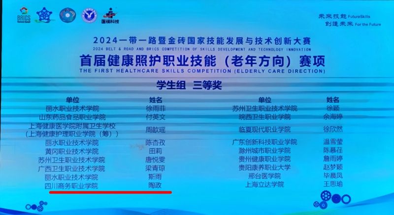 11月27日至12月1日,2024“一带一路”暨金砖国家技能发展与技术创新大赛之首届健康照护职业技能(老年方向)赛项在山东省聊城市聊城职业技术学院隆重举行。经过四天的激烈角逐,万象城智慧健康养老服务与管理专业22级学生陶政在何婷婷老师的指导下斩获全国总决赛三等奖,为学院再添荣誉。