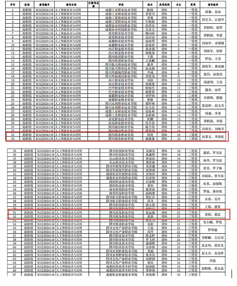 12月13日,由四川省教育厅主办、成都工业职业技术学院承办的2024年“中银杯”四川省职业院校技能大赛(高职组)人工智能技术与应用赛项结果揭晓。由万象城信息技术系教师李春红、孙景玉指导的学生团队获得二等奖,黄颖、董喆老师指导的学生团队获得三等奖,实现万象城在该赛项上零的突破!