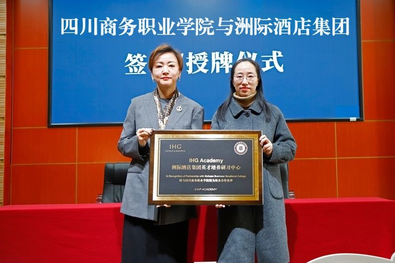 康璐与韩朝靓代表双方签署校企合作协议,并共同为“洲际酒店集团英才培养研习中心”授牌,标志着洲际酒店集团“英才班”正式启动。