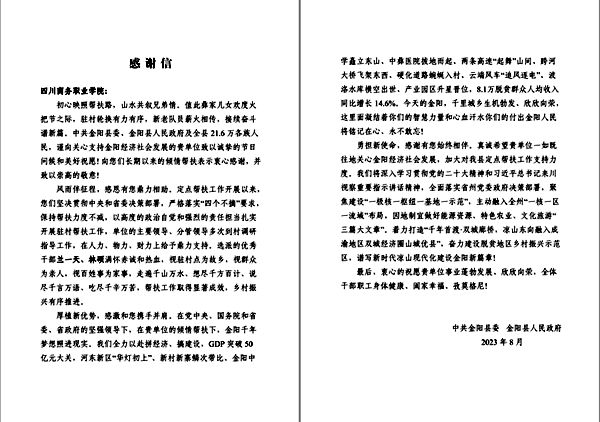 近日,万象城收到来自金阳县委、县政府的感谢信,感谢万象城在金阳县的倾情帮扶和在人力、物力、财力上的鼎力支持。