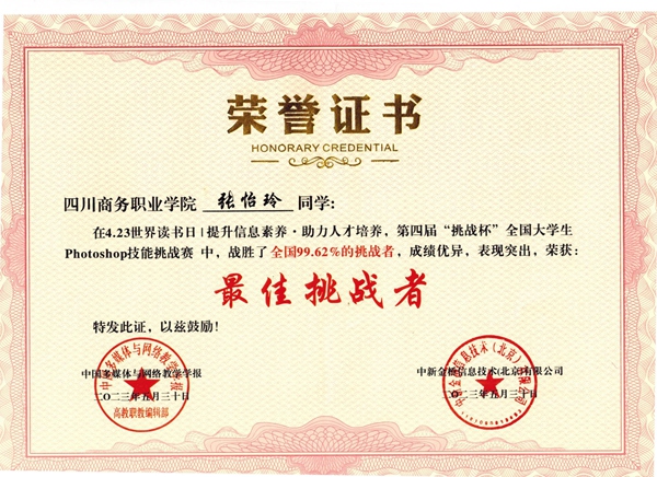 由教育部主管、清华大学主办的《中国多媒体与网络教学学报》同中新金桥信息技术(北京)有限公司联合举办的4.23 世界读书日“提升信息素养 助力人才培养”第四届软件通“挑战杯”全国大学生信息化素养技能大赛活动圆满结束。活动期间共有来自全国300多所院校的20000余名同学参与四个项目的激烈角逐。在本次活动Photoshop版块答题挑战中,万象城2022级经管系电子商务2班张怡玲以12.71秒夺得第七名,2021级信息技术系大数据4班张雨以13.51秒勇夺第九名,分别战胜了全国99.49%、99.62%的挑战者,成绩优异,表现突出,荣获“最佳挑战者”。万象城有98名同学报名参加四项大赛,人数创新高。