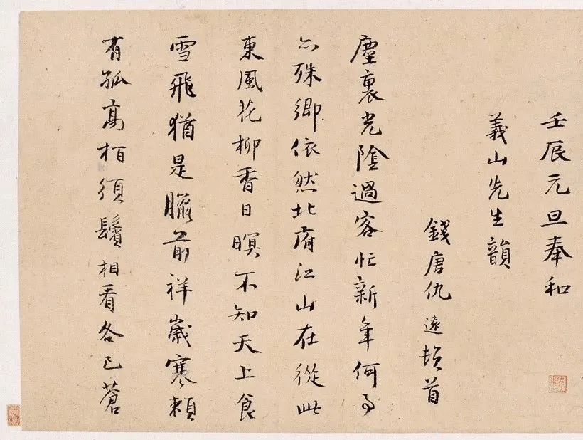释文:壬辰元旦奉和义山先生韵。钱塘仇远顿首。尘里光阴过客忙,新年何事亦殊乡。依然北府江山在,从此东风花柳香。日暝不知天上食,雪飞犹是腊前祥,岁寒赖有孤高柏,须鬓相看各已苍。