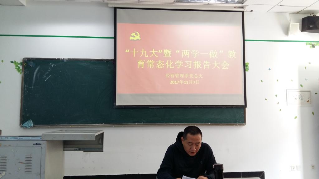 2017年11月28日下午两点整,经营管理系党总支全体党员于第一教学楼202室开展“不忘初心,牢记使命”主题党日活动,活动由系党总支书记郑海波主持。 一、认真学习学院关于认真学习宣传贯彻党的十九大精神通知 一)在郑...