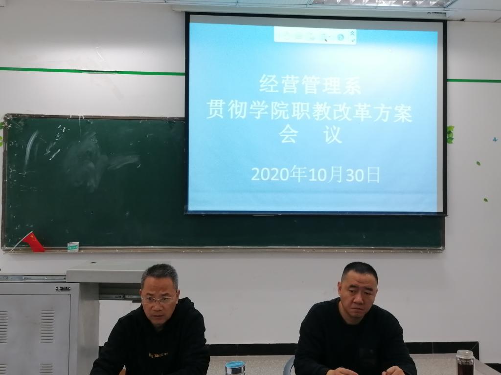 2020年10月30日上午9:30分,经营管理系召开学习《学院贯彻工作方案》专题会,会议由系主任梁栋同志主持,全系行政人员、各专业负责人参加了会议。 会上,系主任带领大家全文学习了学院贯彻《四川省职业教育改革实施方...