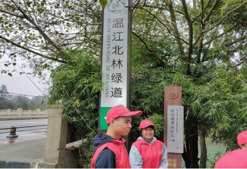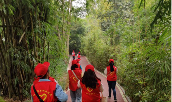 (图为志愿者们到达温江北林绿道)