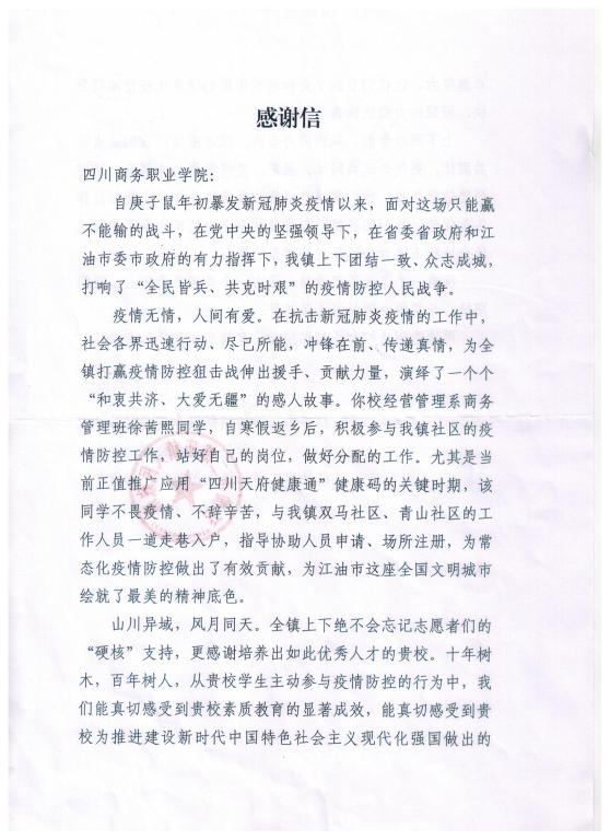 经营管理系20级商务管理班徐茜熙同学在去年新冠肺炎爆发期间,积极参加到江油市二郎庙镇社区的疫情防控工作中,不辞辛苦,为当地常态化疫情防疫工作作出了贡献。江油市二郎庙镇防疫办为表达感谢之情,特向万象城发来感谢信,充分肯定了徐茜熙同学的担当与奉献。
