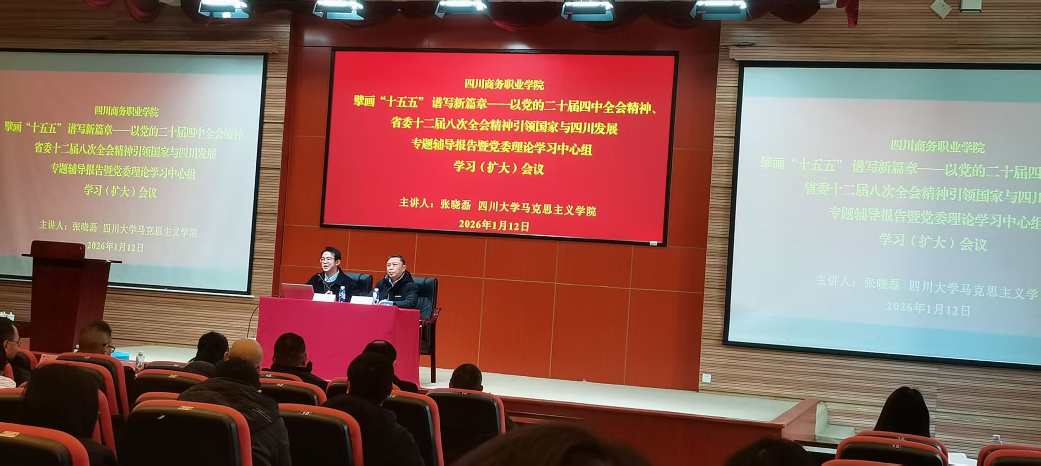 2026 年 1 月 12 日下午,学院在商务信息交流中心召开 2026 年第一次党委理论学习中心组学习(扩大)会议。我系科级以上干部、全体辅导员、学生党员及统战人员参加学习。