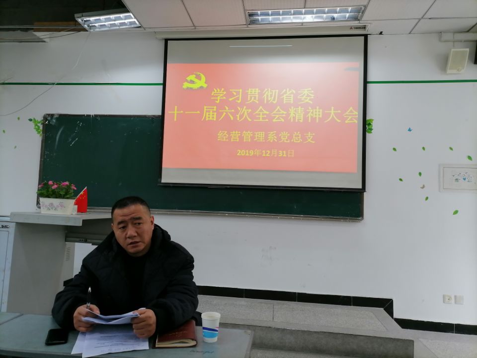 2019年12月31日,经管系总支在1教202教室召开全体党员会议,认真学习了省委十一届六次全会精神。党总支记郑海波主持会议并传达学习了省委十一届六次全会和学院第十五次中心组学习会议精神。
