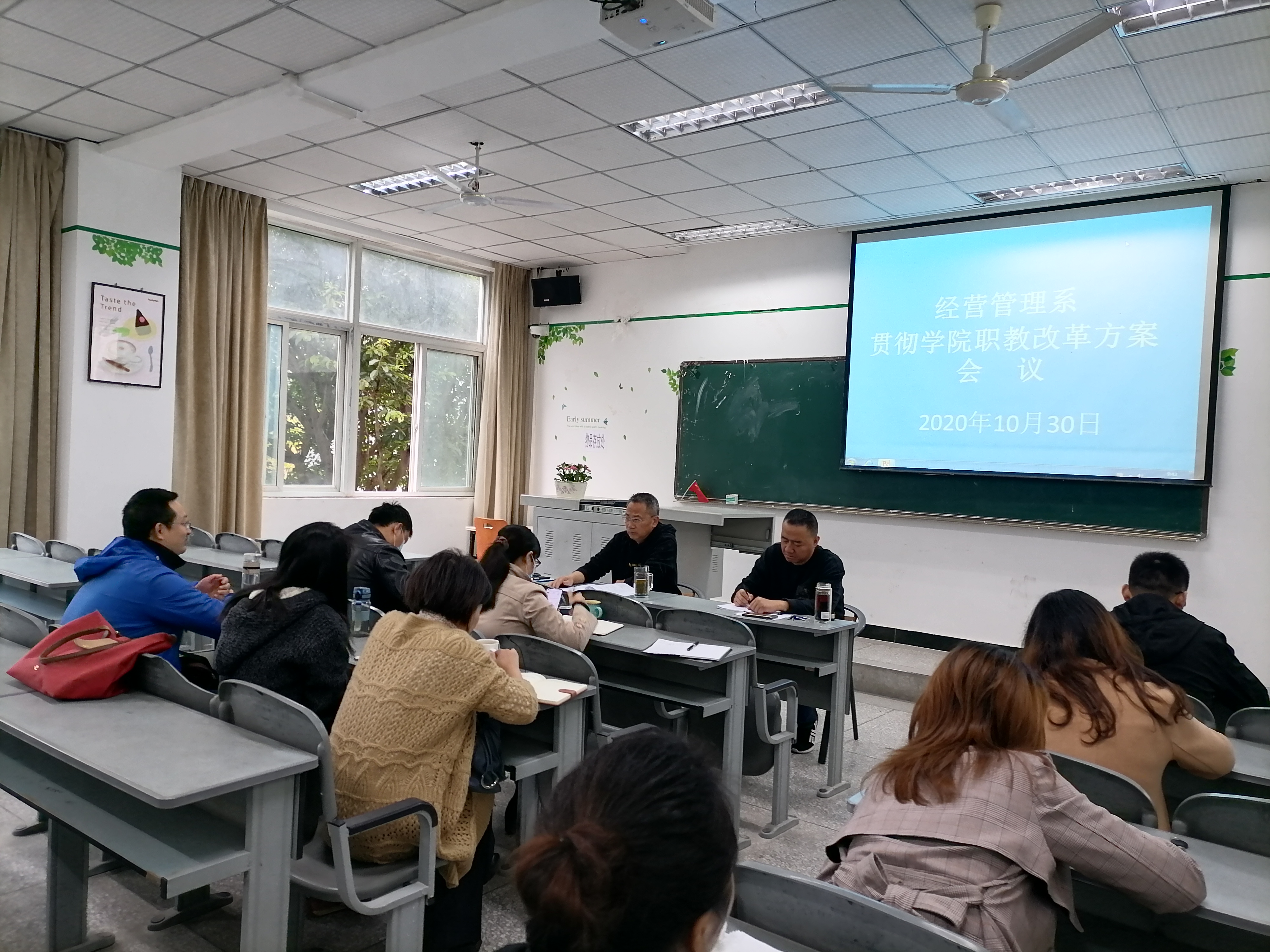 2020年10月30日上午9:30分,经营管理系召开学习《学院贯彻<四川省职业教育改革实施方案>工作方案》专题会,会议由系主任梁栋同志主持,全系行政人员、各专业负责人参加了会议。