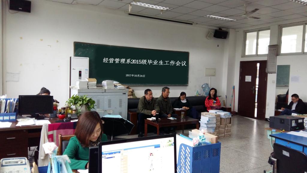 2017年10月24日上午9点30分,经营管理系于第一教学楼306室召开毕业生工作会议。出席会议的有经管系主任梁栋,系党总支书记郑海波,系副主任王琦,系党政办主任朱永泉,各教研室负责人,全体辅导员和行政人员。