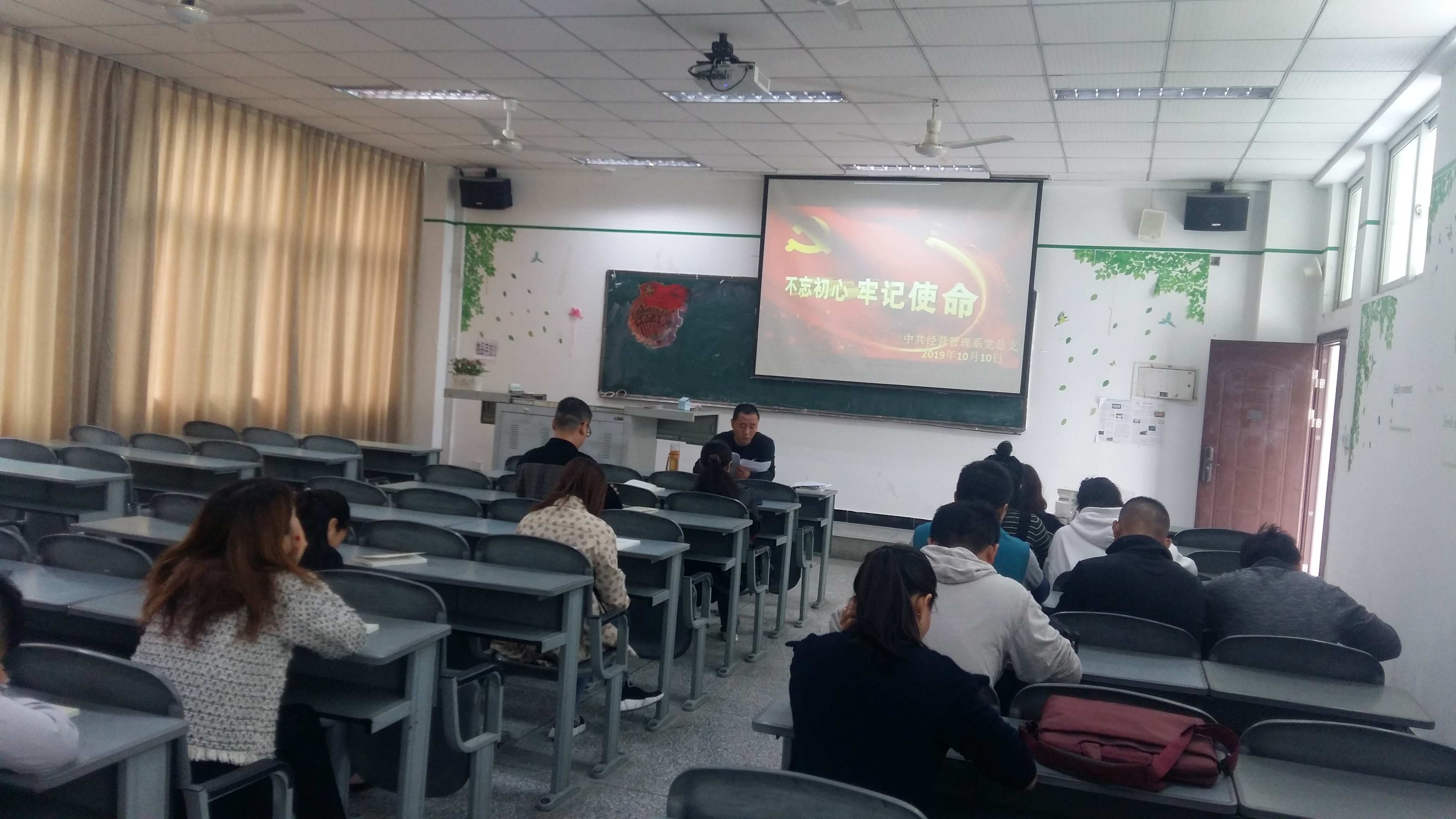 2019年10月10日中午1:00,经营管理系党总支全系党员在1教202室组织开展“不忘初心、牢记使命”主题教育活动。会议由系总支书记郑海波主持。
