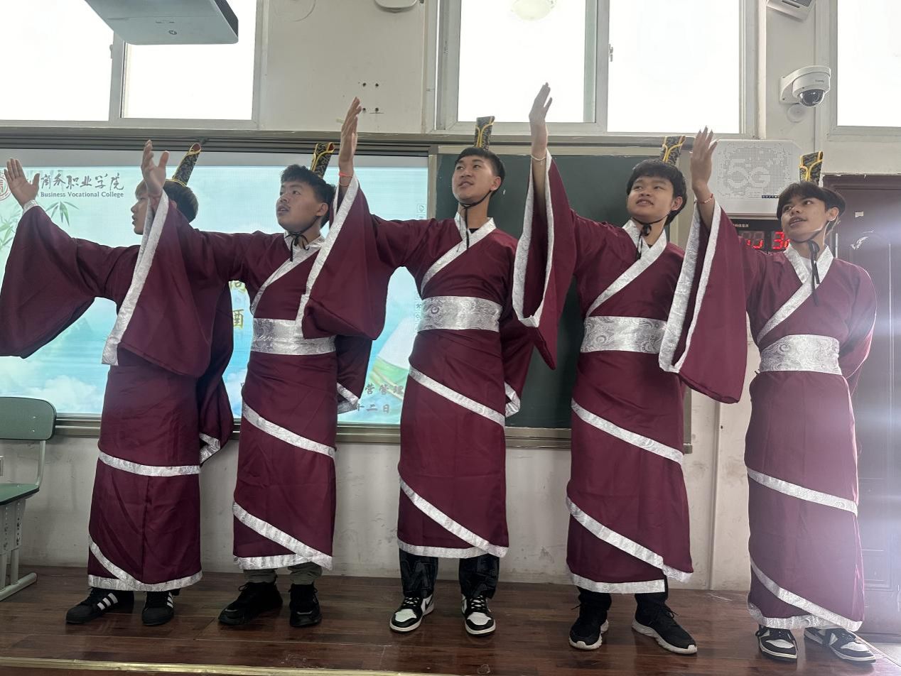 本次活动主要分为共读屈原诗、共答端午题和共画端午扇三个部分。活动开场,老挝留学生同学代表为大家带来《将进酒》诗词朗诵表演,演绎了一场精彩的跨文化盛宴;辅导员彭萍老师为同学们精彩讲授了端午节的由来与传承,以及爱国诗人屈原的故事;在共答端午题环节,中老同学积极参与,现场氛围热烈;活动最后共画端午扇环节,中老学生互相交流心得,共同学习执笔,完成充满中国文化特色的精美团扇。