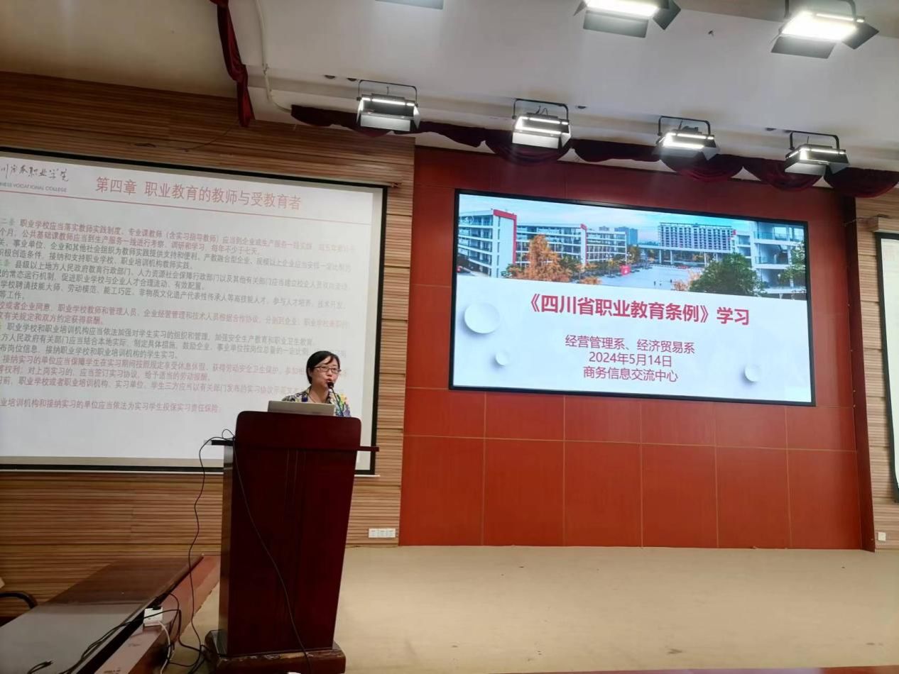 分享会后,经营管理系主任王琦带领两系教师学习了《四川省职业教育条例》(以下简称《条例》)。王琦主任就《条例》的主要内容作了介绍,并从颁布背景、学习要点和贯彻落实三个方面作了解读,并指出,《条例》是深入贯彻习近平总书记重要指示批示精神和党中央、国务院关于职业教育改革发展的决策部署,将为全面建设社会主义现代化四川提供有力人才和技能支撑,对两系未来发展更有重要指导意义