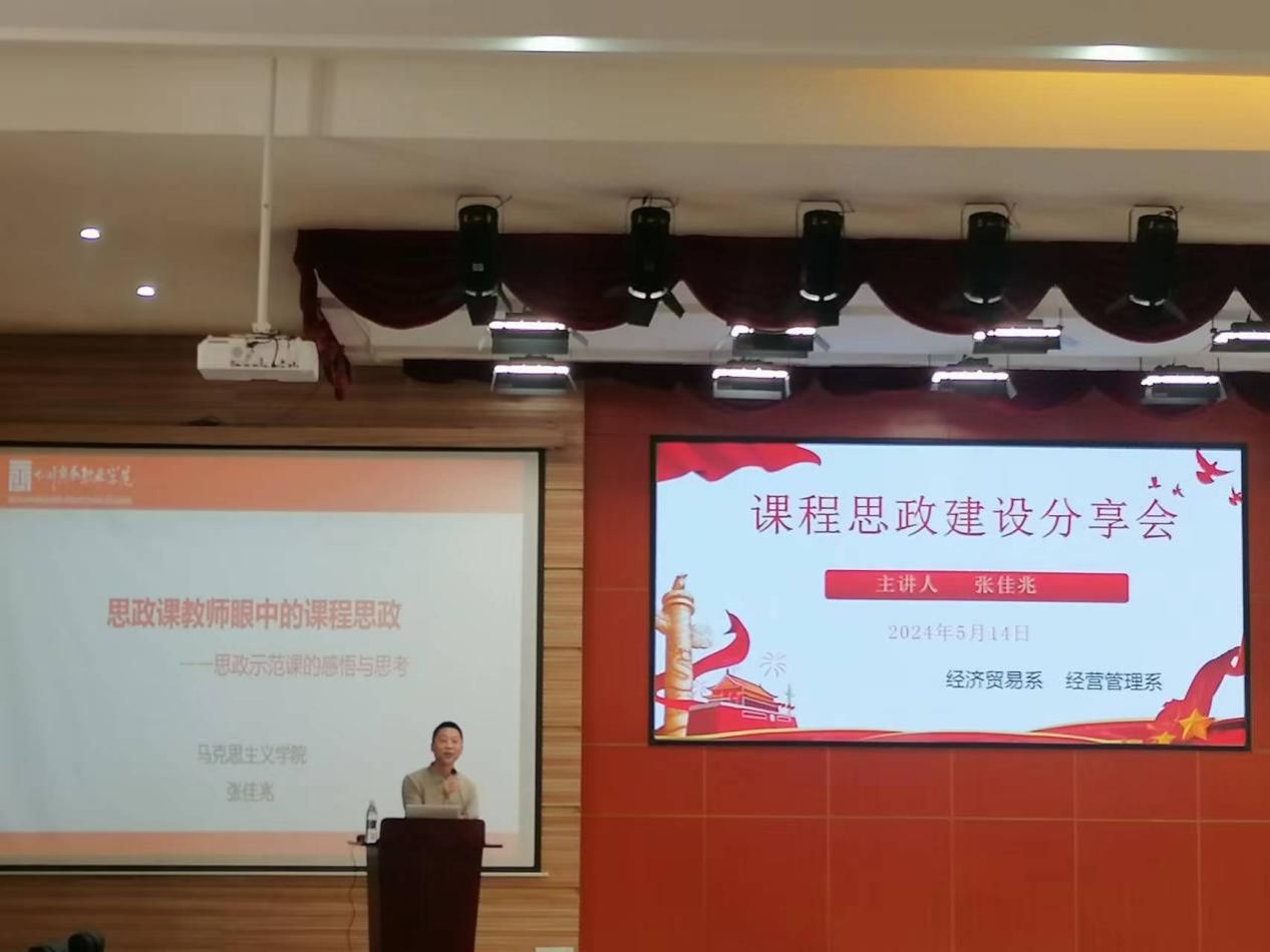 为深入推进思政课程与课程思政同向同行、协同育人,进一步推进课程思政与思政课程多元化、多层次协同联合与创新融合。5月14日,经济贸易系、经营管理系联合举办课程思政课程建设分享会。分享会由马克思主义学院青年教师张佳兆老师担任主讲,经贸系副主任李静主持。