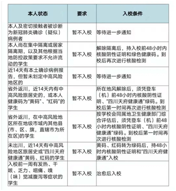 川内新生入校要求:低风险地区的学生非必要不离川,不前往省内外中高风险地区。开学前持“四川天府健康通”绿码和入校前48小时内核酸检测阴性证明入校。