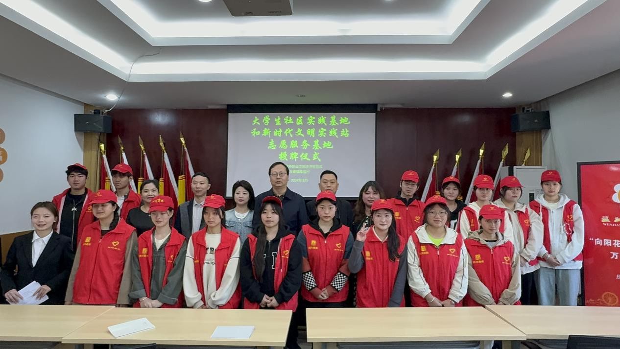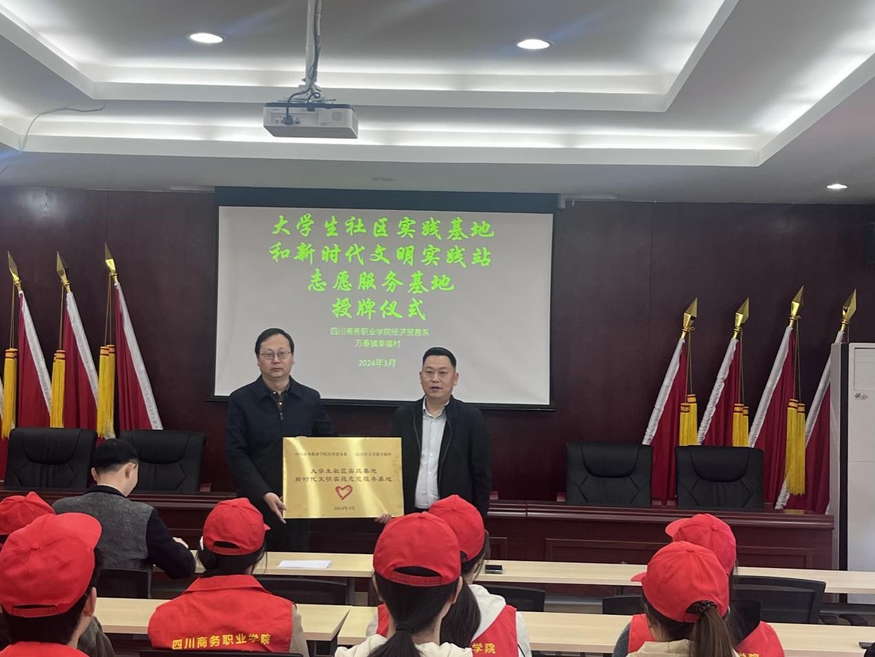 2024年3月29日上午,万象城awcsport官网经济贸易系与万春镇幸福村“大学生社区实践基地”和“新时代文明实践志愿服务基地”授牌仪式在幸福村村委会举行。幸福村党委书记唐小兵,“村两委”委员文龙,刘娇,学院党政办主任、经济贸易系党总支书记管齐峰,经济贸易系党政办主任马如龙,团总支书记庞莹莹以及学生代表参加了仪式。