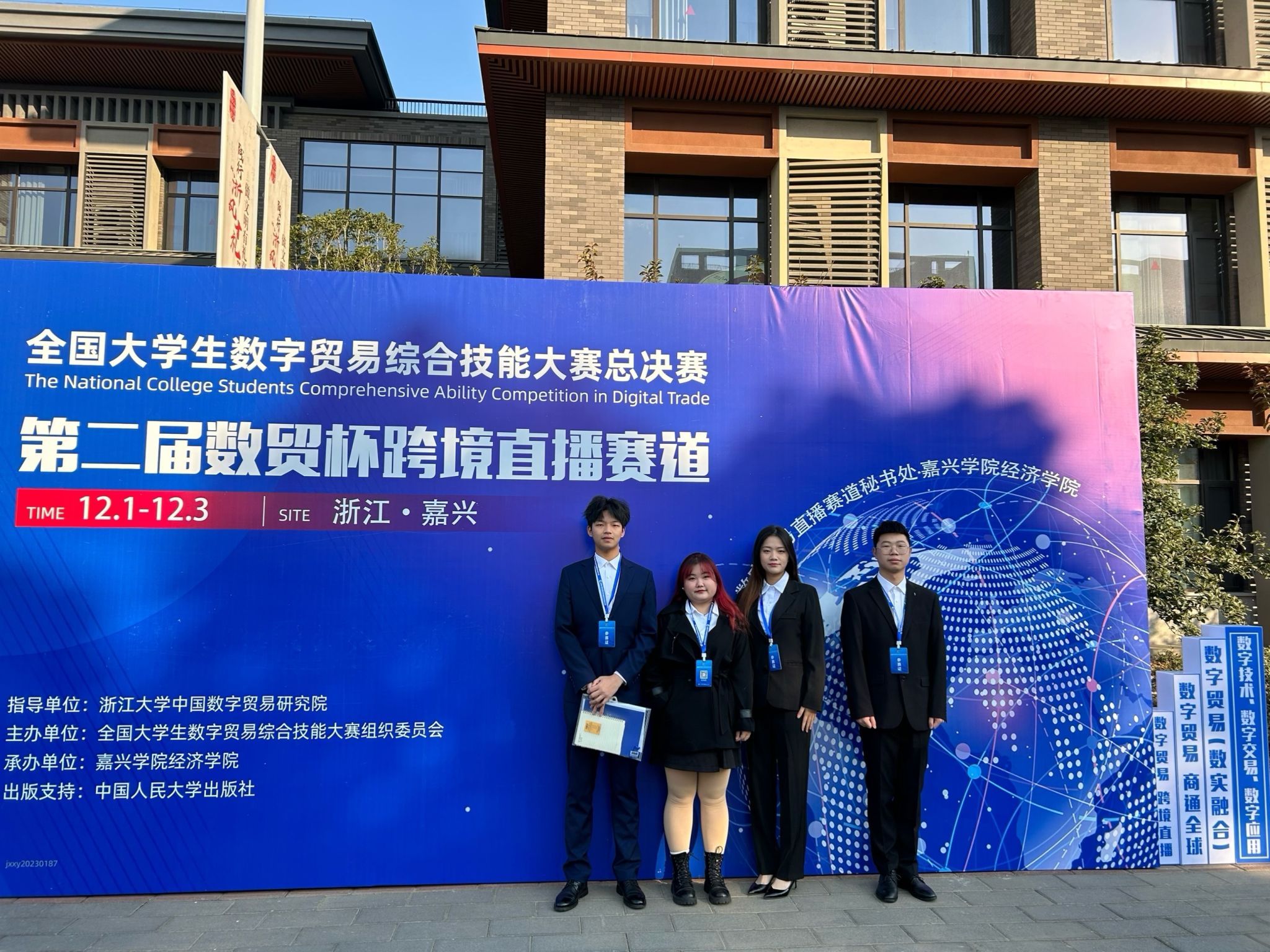 2023年12月1-3日,第二届全国大学生数字贸易综合技能大赛数字贸易直播全国总决赛在嘉兴学院经济学院举行。经济贸易系跨境电商、国际商务、智慧健康养老服务与管理专业学生王建杰、黎伍淘、李欣宇、邱艺佳四位同学沉着应赛,从对外经贸大学、宁波大学等六十支决赛队伍中脱颖而出,荣获一等奖,董恩慈、刘茜老师荣获优秀指导老师。学院也是进入现场赛的唯一高职专科学校。