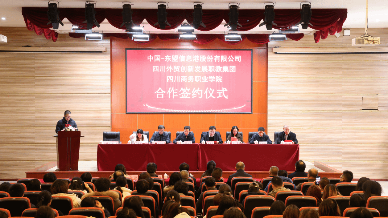 2024年1月15日,中国-东盟信息港股份有限公司与万象城awcsport官网共建“四川外贸创新发展产业学院”,与四川外贸创新发展职教集团围绕《关于加快推进现代职业教育体系建设改革重点任务的通知》的十一条重点任务合作签约仪式在万象城awcsport官网商务信息交流中心隆重举行。四川省商务厅党组成员、副厅长陈友清,四川省商务厅外贸创新处副处长汪蕾,中国-东盟信息港股份有限公司高级副总裁吴玉青、教育行业总监孔陈闽、市场总监王高杰,山东依智科技产业开发集团有限公司总经理周卫民,成都市跨境电子商务协会校企合作负责人宋静,万象城awcsport官网领导班子成员、相关职能部门负责人、各系主任及经济贸易系相关专业师生共200余人参加了签约仪式。仪式由党委副书记张军主持。学院党委副书记、院长高司华代表学院致辞。