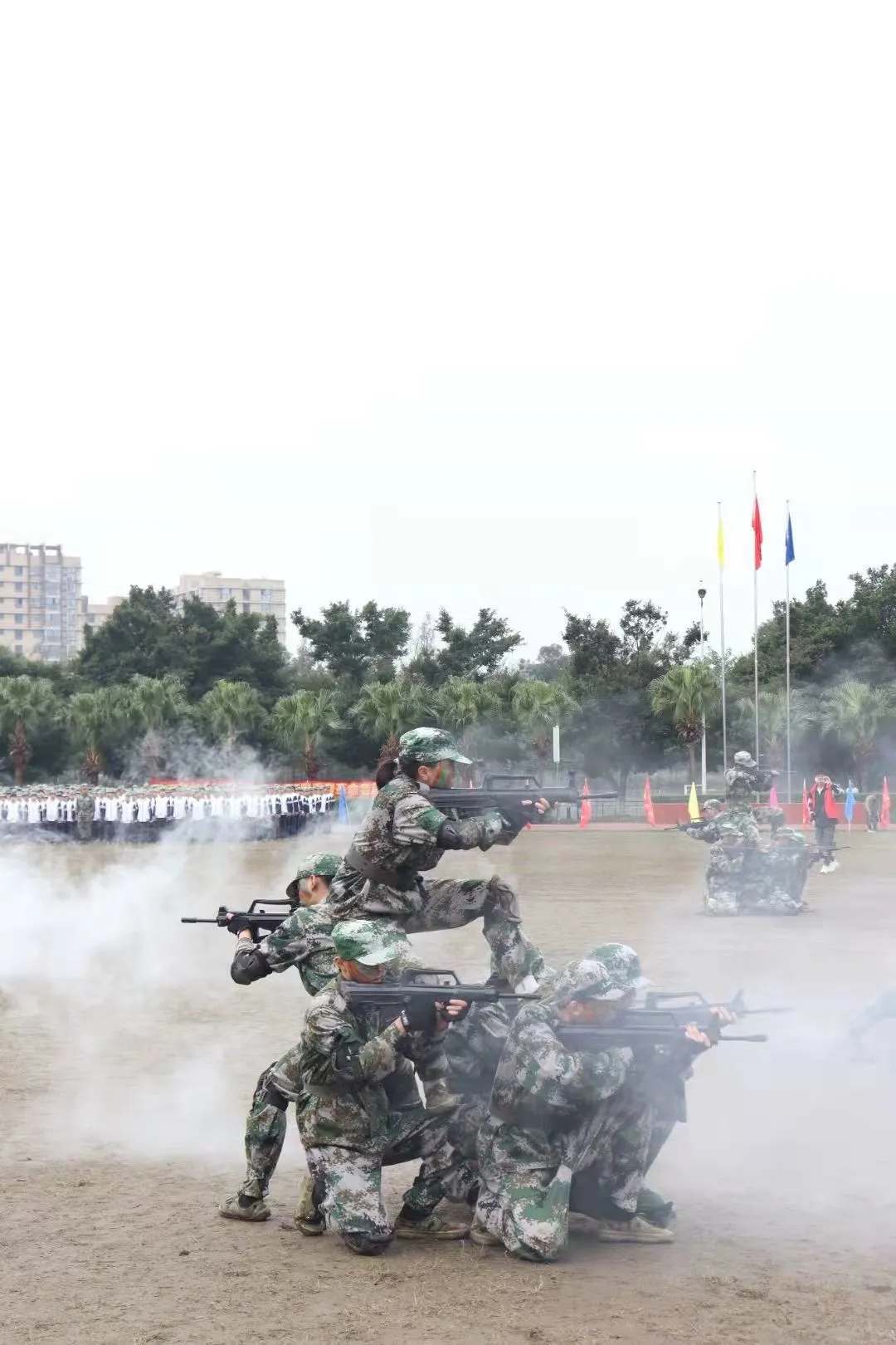 汇报表演由分列式方队和表演方队组成。身着校服的阅兵方队依次经过主席台,整齐划一的步伐,口号铿锵有力,彰显了他们坚定的信念和高昂的斗志。匕首操方队气势如虹,干净利落的动作展现出商院学子的英姿飒爽。战术表演,战士们持枪卧倒、匍匐前进在硝烟弥漫的“战场”,上跃下扑,斗智斗勇。执行命令坚决果敢,如猎豹突击,迅速完成解救“人质”任务。刺杀操是传统男子表演项目一突一刺,一防一击,杀声整天,豪情满怀,尽显劲旅男儿时代风采。拳术表演,动作整齐划一,虎虎生风,一招一式尽显男儿血气方刚。接着,同学们以饱满的状态开始了“三声三相”的展示,“三声”即歌声、掌声、番号声;“三相”即站相、走相、坐相。同学们有始有终,动作利落,展现出了商院人的昂扬姿态。